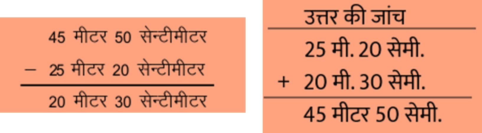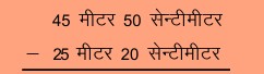उदाहरण: पहला पेड़, तीसरे पेड़ से 45 मीटर 50 सेंटीमीटर की दूरी पर है। दूसरा पेड़, तीसरे पेड़ से 25 मीटर 20 सेंटीमीटर की दूरी पर है। बताओ पहले व दूसरे पेड़ के बीच में कितनी दूरी है?
